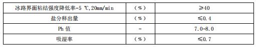 掺盐化物原料的沥青混合料路用性能指标不低于《公路沥青路面施工技术规范》JTG F40-2017 中的相关规定,盐化物原料高温动水冲刷性能要求如下:残留稳定度比≥80%;毛体积相对密度变化率≤1.2%。 盐化物添加比例一般不低于矿料质量的 5%,以实际目标配合比设计、技术服务确定为准。盐化物原料抗冰冻融雪性能要求见下表。