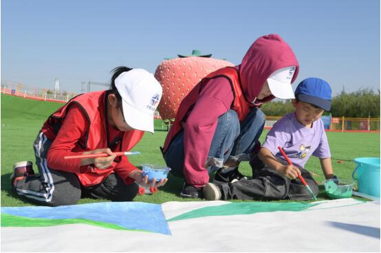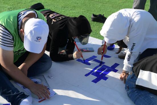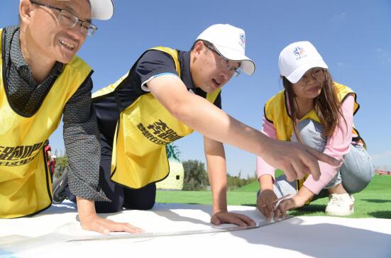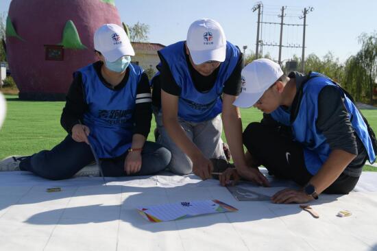 正午,伴着炎炎烈日,红、黄、蓝、绿四队斗志昂扬,领取物料,小队内部职能分工——绘画组、外协组、涂色组。长6.8米、宽4米的纳斯卡巨画第一步骤极大的考验大家的体力及细心程度,白色画布在烈日的照耀下直晃人眼,但每个团队的成员都极其有耐心的或爬、或跪、或蹲,在白画上一笔一笔绘制网格,确定坐标,笔笔慎重,分毫必较,严谨、细致的工作态度让人钦佩。这边绘画组紧张忙碌着,那边外协组也没有闲着,积极与其他团队做好协商、交流,力争四幅画作在最终合体的时候能无缝对接。14:00-17:30,体力的消耗加上炎热的天气,没有消磨队员的斗志与毅力,历经3个多小时,四幅画作全部完成,巨画拼接,当“传承、改变、革新、发展”精彩呈现的那一刻,每个队员都成就感满满;当“奔跑吧,宁夏公路”的呐喊声冲向云霄的时候,每个队员都笑逐颜开、欢欣鼓舞。