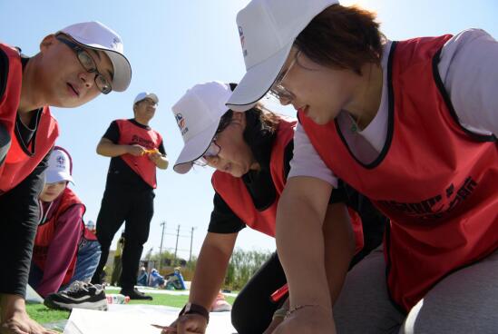 在总教练的指挥下,66人随机分为红、黄、蓝、绿四队。分队结束后,各个团队立即行动起来,选队长、起队名、画队旗、建队呼,分别进行了各具特色、妙趣横生的团队亮相,彼时掌声、笑声此起彼伏,团队默契度、向心力充分展现。