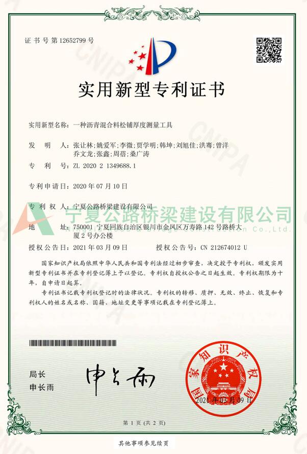 实用新型专利: 一种沥青混合料松铺厚度测量工具