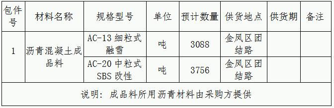 本次路面沥青混凝土成品料采购共划分为1个包件,可参与报价的包件数1个,可成交包件数1个,具体内容如下表: