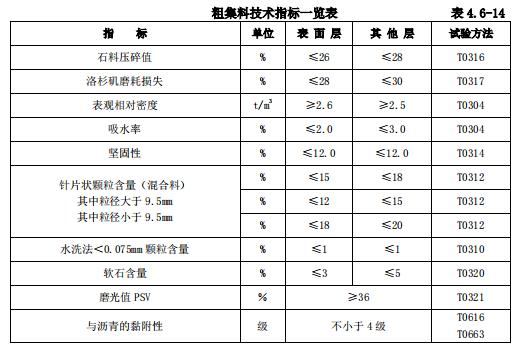 沥青面层的粗集料应洁净、干燥、表面粗糙、无风化、无杂质,具有足够的强度、耐磨耗性。粗集料应具有良好的颗粒形状。路面抗滑表层粗集料应选用坚硬、耐磨耗、抗冲击力的碎石,不得使用筛选砾石、矿渣及软质集料。粗集料质量应符合表 4-6-13 的要求。当采用的粗集料对沥青的粘附性和沥青混合料的水稳定性不符合要求时,可采用掺加部分消石灰或水泥代替石粉等措施,使沥青混合料的水稳定性检验达到要求。