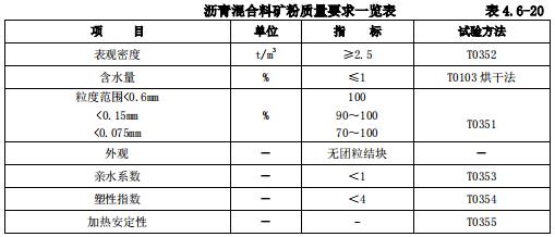 沥青混合料用矿粉必须采用石灰岩或岩浆岩中的强基性岩石等憎水性石料经磨细得到的矿粉,原石料中的泥土应除净。矿粉应干燥、洁净、不成团块,能自由地从矿粉仓流出,其质量应符合下表的要求。